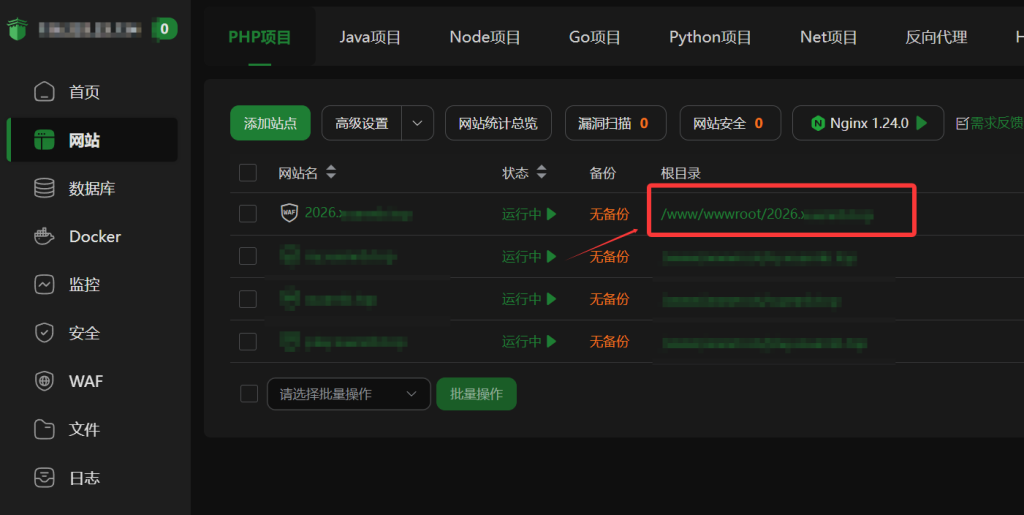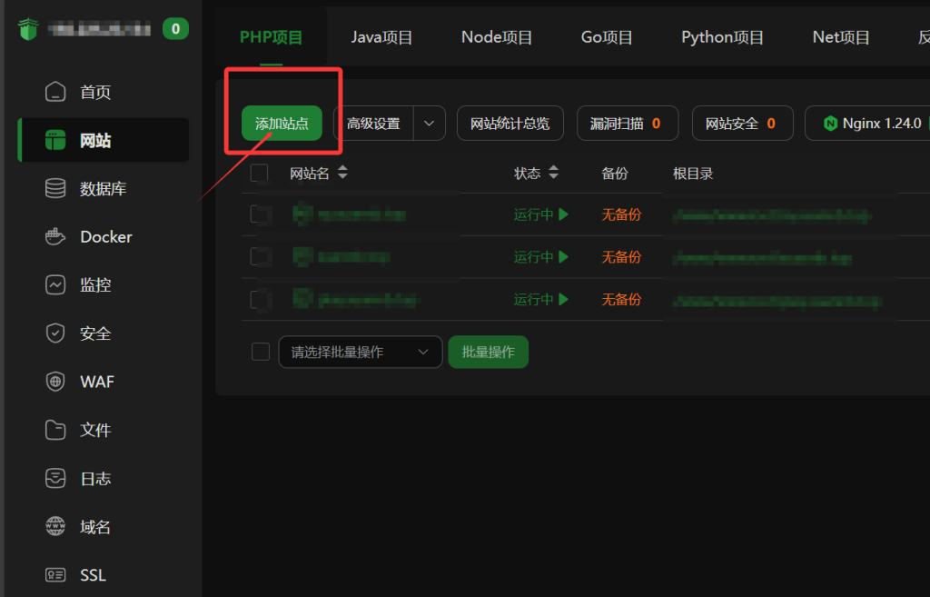 访问宝塔面板,找到网站,点击添加站点。(要求环境:PHP 7.0+ MySQL Nginx1.24+ HTML5)