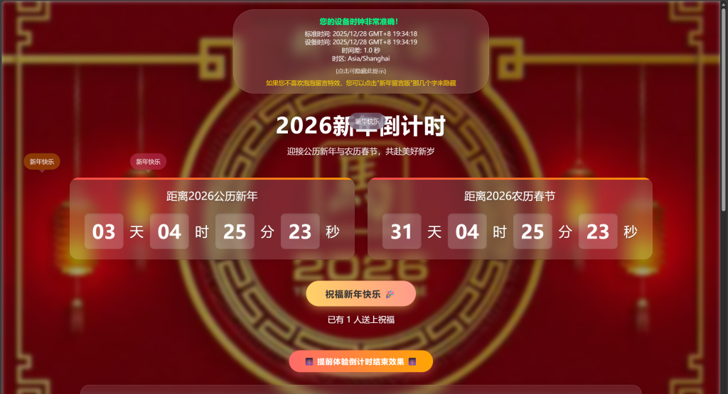 双倒计时显示:同时展示距离2026年公历新年(1月1日)和农历春节(1月29日)的剩余时间