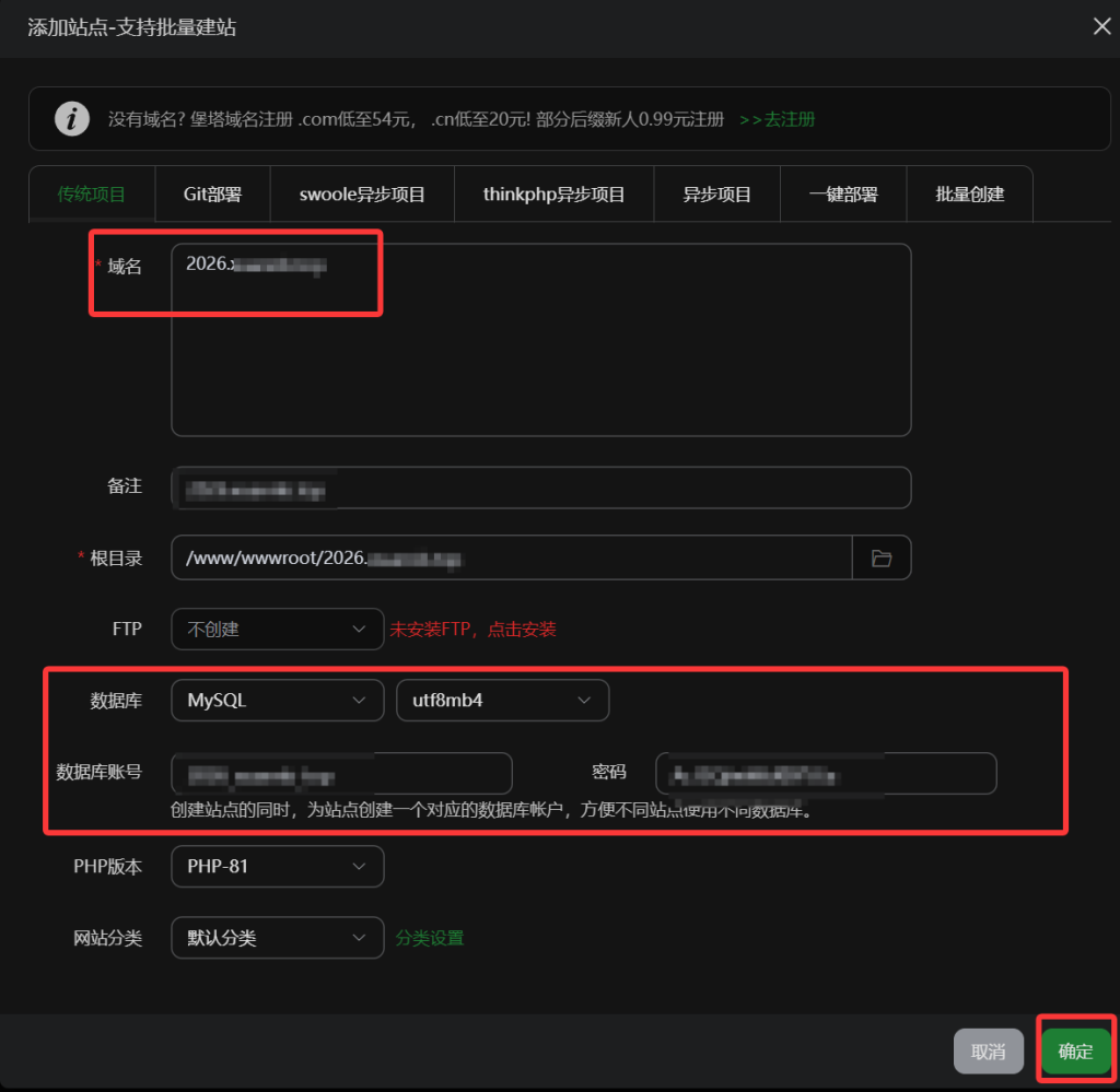 将可访问的网站域名填入到域名里面,根据图片要求创建站点,点击确认即可。