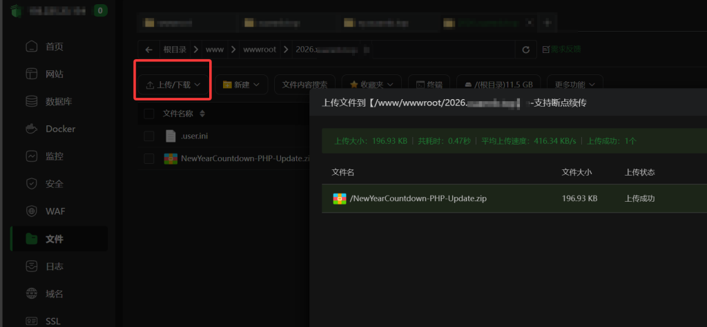 点击上传,把网站源代码zip上传。上传成功后关闭。